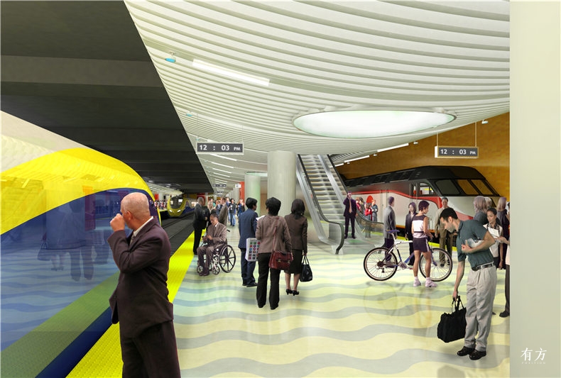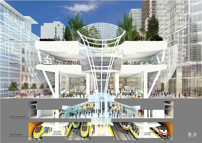 中央站厅设于地下一层,连接首层与火车站层,为商业、售票、自行车停放空间。通过“光柱” ,延续了地面明亮温暖的氛围。在地下二层,可通过三个站台搭乘火车,六条铁轨分别服务于加州火车系统(Caltrain)和加州高铁系统(Califoia High-Speed Rail)。