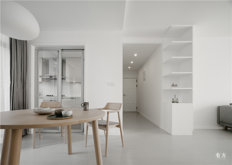 同时,为了让设计更具持久性,避免落入“流行色”的消费主义圈套,团队推荐以白色、灰色、木色此类中性色为主色,并保留了原有地板,对其仅进行简单打磨并上漆翻新。清爽的地板色不但能与室外时时更迭的商业社会拉开距离,也能给予整套公寓安静,甚至类似美术馆的氛围,而这样的设定也符合户主本身特性。由于背景干净类似展厅,家具在此会显得尤为突出,因此精而简成为主要挑选策略。虽然我们挑选了不同品牌的灯具,沙发,餐桌,但其轮廓线条却有着一定相似性。而为了避免设备破坏整洁的氛围,空调或藏于柜内,或置于次要墙面,而所有皮管则均从室外绕行。