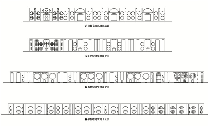 斜线延伸的秘书住宿建筑沿着西北向的湖面展开,每个单体的中心楼梯间在四个方向上分别是住宿单元和面湖的凉廊。墙体上巨大的开口在结构上是上下对称的拱券,这些构造清晰、尺度巨大的开口在首都综合体随处可见,它们部分地解释了国会建筑抽象的混凝土形式。自造的文脉和它的抽象物同时存在。