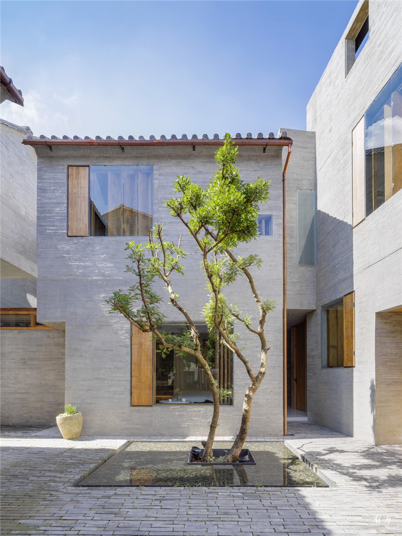 建筑沿街的外墙面根据规范的要求需要完全是传统建筑的模样,所以就预留出了二十公分的厚度,土建完工后再用传统毛石墙体的砌筑方式来覆盖整个外立面,并在毛石墙面的端头复原了传统的“封火檐”做法。这大概也算一个被动的“装饰性”策略,但完成后的效果却让这个酒店的形象完全融入了古城的背景,从入口拾级而上,步入混凝土塑成的小天地后,反倒是多了一层别有洞天的感觉。