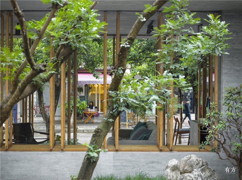 透明性还体现在东西向度。咖啡厅东西两侧的立面都是玻璃窗扇,也可以完全打开,所以从街道上看,这个酒店并没有一个突出的立面造型,倒是更像绿树掩映下的一个舞台布景。我们用一道反梁实现了一个11米的开口跨度,因为场地比街道抬高了1.3米,从街道上看这个立面就更像一个舞台的台口。咖啡厅的来来往往和酒店里的进进出出,由之都产生了舞台剧的效果。透过咖啡厅,还可以瞥见前庭清香木的树冠而略窥酒店之堂奥。反过来,如果坐在2号客房(前庭水面西侧)的躺椅上,视线可以掠过清香木的枝叶,穿过咖啡厅的室内看到街上的人来人往。