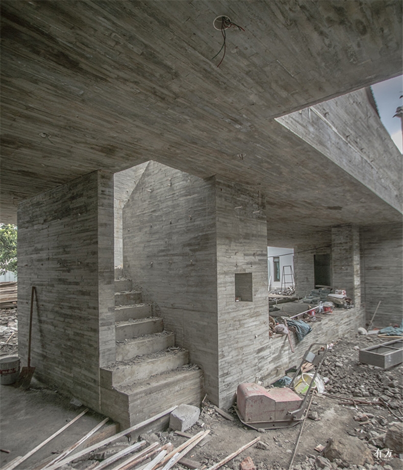 作为一个剪力墙结构支撑起来的房子,最直接的建筑外墙材料当然是清水混凝土。但毕竟这是一块租来的地,二十年后地和房子都要还给房东,我也不好意思跟甲方要求采用相对昂贵的建造工法。没想到老赖居然主动提出能否尝试清水混凝土,实在是让我意外而且感动。同样幸运的是在昆明结识了对材料和建造有着近乎偏执热情和丰富经验的杜杰跟他的杜·清水营造团队,不然在云南这样的小项目上来挑战对施工工艺和流程管理要求颇高的清水混凝土,我们完全没有把握。