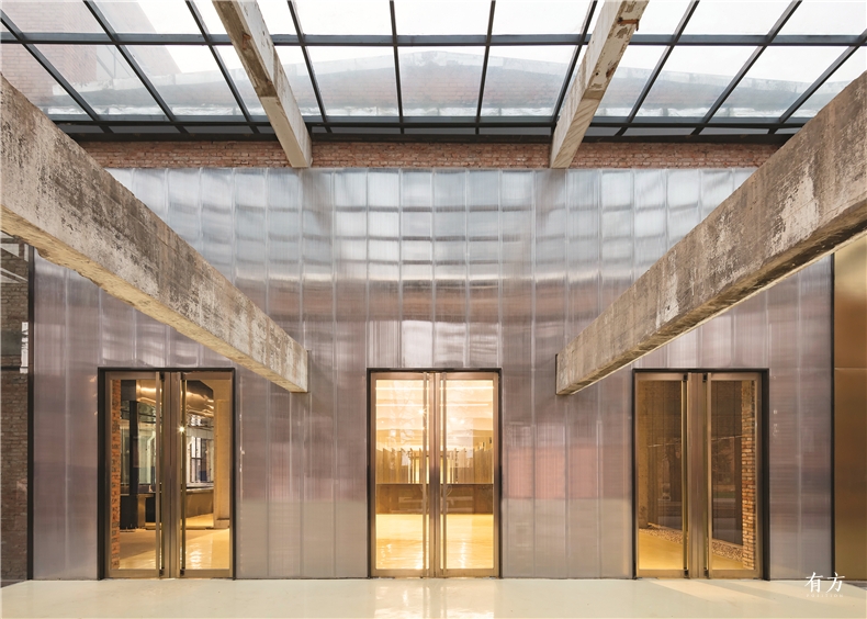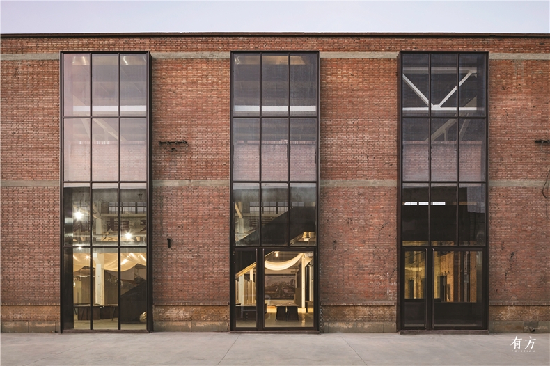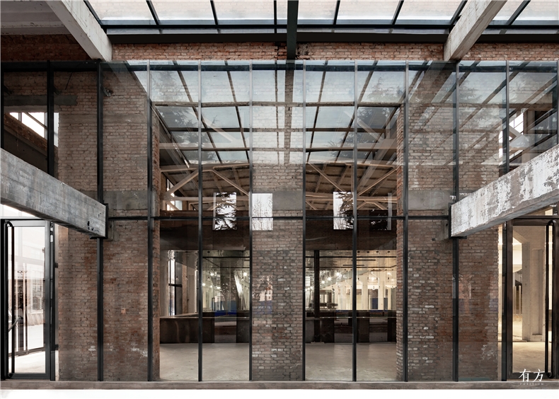 原轴承厂东面扩建了一个结构密集的办公区域。设计团队提议拆除所有的室内扩建区,改造成一个半开敞的空间作为博览中心的主入口,这使厂房原始立面表现出来。扩改的本意是通过不加任何多余元素重构原始门窗,提升入场秩序性和可访性。通过外突的黑色金属框及透明双层玻璃强调了厂房南立面的节奏,同时转轴门的设计也便于户外的活动。