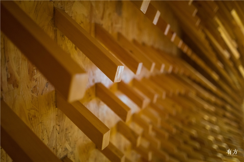 999 根松木在一个矩形的空间中向心排列,沿内置的椭圆形进行切割,每一根木方,有了自己的角度和长短。内部的空间也有了相对清晰的边界。木方在3.8 米×4.7 米的矩形界定和椭圆形的内部空间之间,形成了一种半透明的围合。这是一种两个几何体,三种密度的交叠。每一个维度上都呈现出一种精密的运动和变化。木方端部的斜切面,映射了外部的光,视线在空间中描摹出渐进的圆,而圆在收放之间,完成了对形的塑造。
