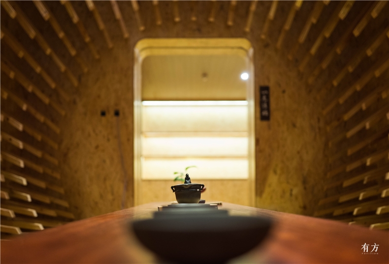 空间的端部,一侧为圆,一侧为方。圆窗临街,方户靠院。正印证了“圆者规体,其势也自转;方者矩形,其势也自安”之势。动静的形态在这间茶室相遇转化,在运动中得以调和。茶室以“万宗归一”为主题,木方的向心性,让居其中的人,自然而然地受到一种内敛地暗示。“归一”与“复始”,是空间力求传达的饮茶状态。在通过水和茶的交流过程中,完成一种心情的过滤和情绪的演变。
