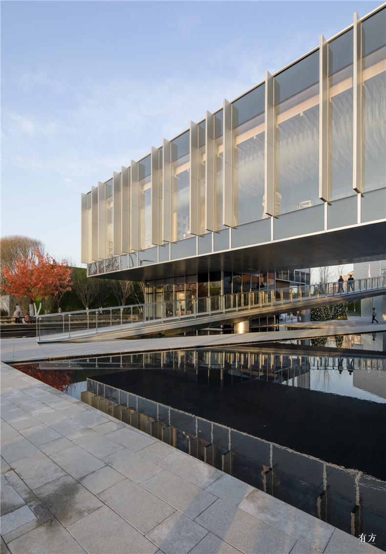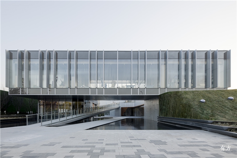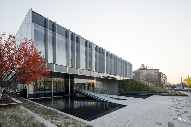 从基地南边远远望去,银灰色的建筑被安静地置于草坡之上,方正的形体与漫反射的铝板材质形成戏剧化的体验,使建筑似是轮廓分明,又似与背景天空融为一体。沿着西侧主入口的方向渐渐接近,建筑的面貌再次发生根本性的变化——从南侧完全封闭的铝板表皮,到西侧完全通透的超白玻幕墙;从南侧呈现自然状态的绿草如茵的草坡,到西侧大跨度的底层架空、人工设计感极强的水池和金属坡道,仿佛建筑本身切割开了两个风格全然不同的世界。