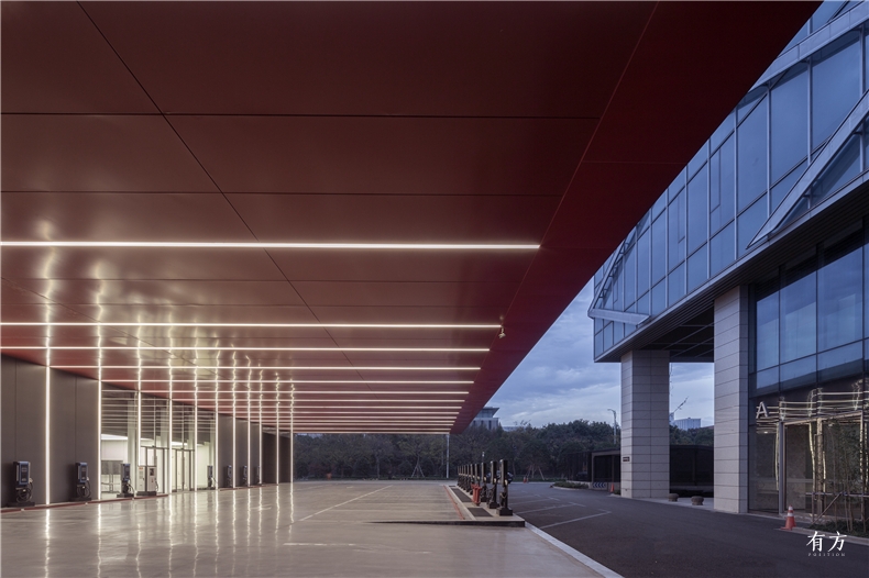 The first layer of building roof adopts red and grey APCP Aluminium-plastic composite panel, LED screen and artificial light source, which not only allows the station to be visibly recognized in an obvious way, but also inherits the tradition of using red as major color for a station. However, the 20m overhang of the charging station’s roof forms a visible contrast with stand columns of a traditional charging station. This gesture of making “heavier” things “easier” and withstanding the gravity shows features of being more open-minded and transparent of this Inteet time, as well as the welcome from the charging station to its users.