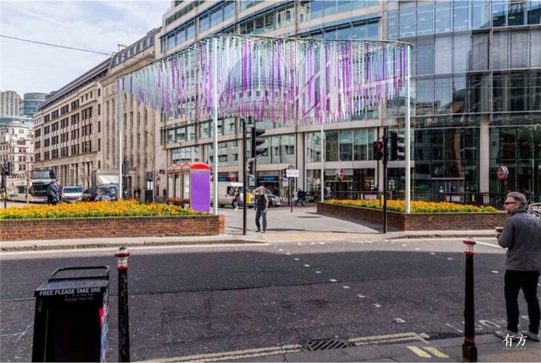 在圣保罗地铁站出口不远处,Scott Whitby Studio用上百根阳极氧化铝棍,反射出了超过四百张圣保罗大教堂的倒影,组成了一个临时的梯形大门。在装置的正中间,用柱子和反射材料还原了当初圣保罗大教堂圆顶的几何规律。这个装置艺术旨在与历史环境产生共鸣的同时一瞥未来。