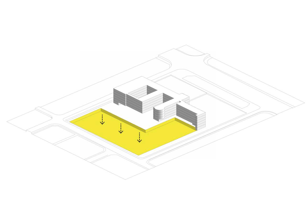 如果我们根据任务书的要求将操场抬高两层,会导致平台下的有效高度变得局促,而且平台和教学楼只能通过三层连接。在最终方案中,操场被抬高了2.5层,使它能够更好地联系各个楼层,也有助于解决建筑内部采光通风的问题。
