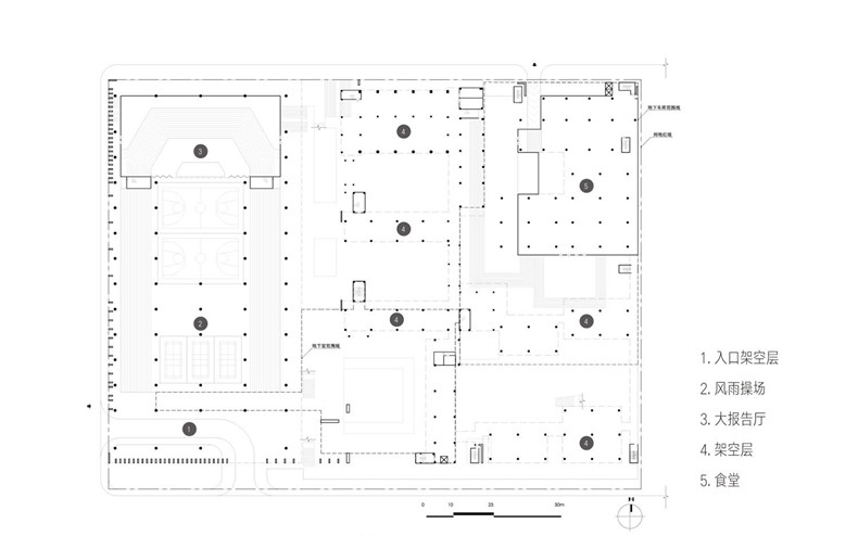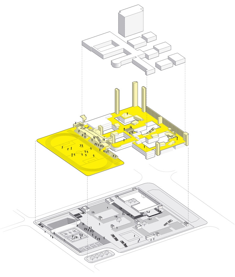 抬起的“地面”跟教学楼是直接连接的,而除此以外,教学楼的每一层都能和这块升起的大板之间有直接联系。我们在操场和老教学楼之间设计了一个多层系统,每一层的走廊都连接着公共活动平台,使学生从老教学楼的每一层都能直接到达这个漂浮的“地面”,不需要任何中转。这些有高差的空间在连接了教学楼的同时,它们的功能使用变得更加自然,不会太跳脱。