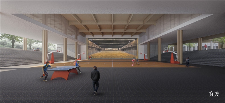 The task book requires that the playground be elevated for two levels, which, indeed, will bring about some problems. If we only lift it for two floors, the platform can only be connected with the 3rd floor, and its relationship with the streets is not good. It will also lead to insufficient space under the court. Therefore, we eventually lifted the playground up for 2.5 levels so that it could better relate to the floors and also help solving the problem of lighting and ventilation inside the building.
