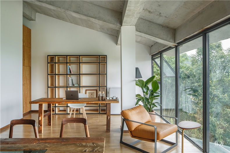 西侧则在对现场进行多次实地考察与调研的基础上(确保在盛夏暴雨时不会有雨水顺着山石流入室内),采用了“融景”设计策略,取消建筑与山体间的维护结构,将山石、草木作为“维护结构”延伸至室内,有机地串联起自然、空间与人之间的直接对话。