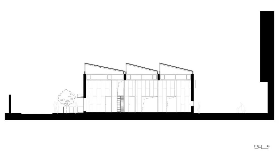因是租用的空间,造价控制和简便施工是我们设计之初的重要考量。空间和建筑元素的操作都比较简练,整体设计可以概括为:建筑形体除了调整洞口之外,新增的有锯齿屋顶、墙面上的出挑雨篷和空调盒子;内部空间的划分主要由一面主隔墙和局部楼板完成。最小的设计动作和最少的元素增加,促使我们仔细打磨每个动作产生的空间意义。